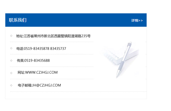 地址:常州市新北區友邦商務大廈1幢16、17層  電話:0519-85101652  傳真:0519-85112595  郵編:213022  網址:www.cz-jiayue_cn.sfhjmj.com  郵箱:xiajifengaa@163.com